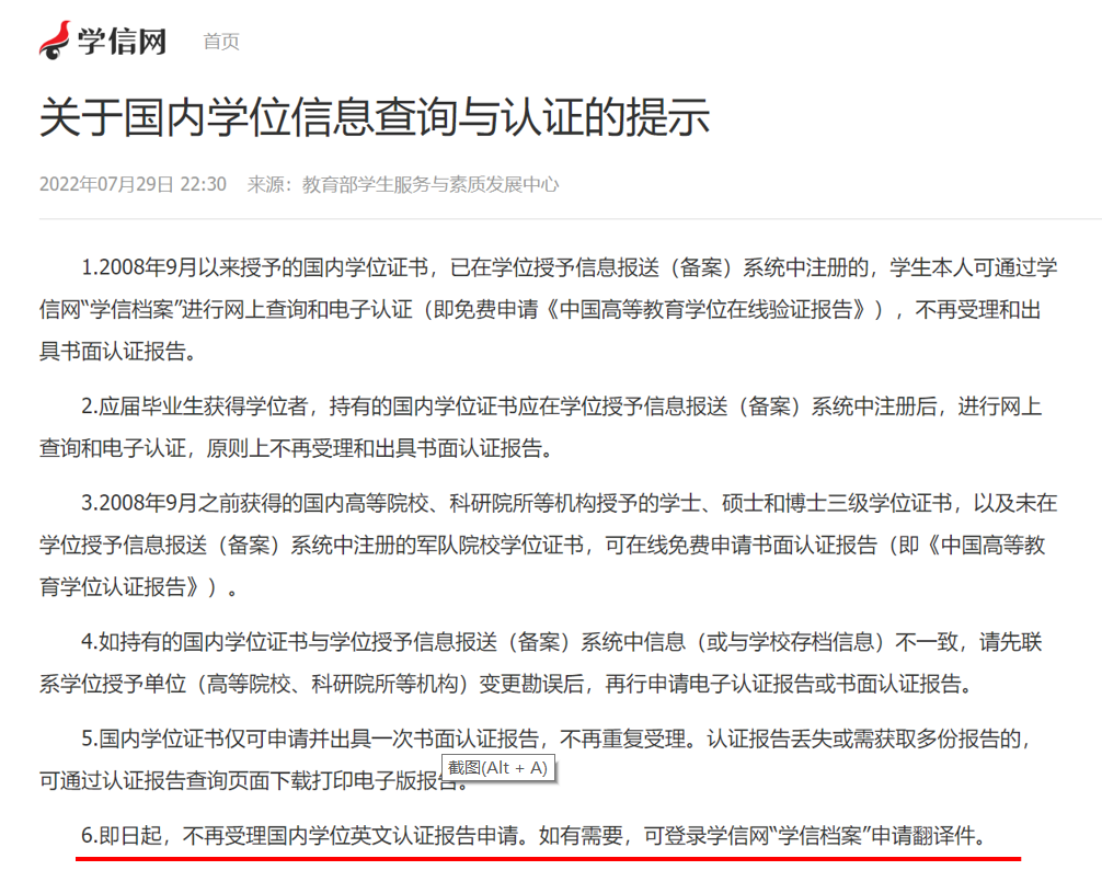 注:如需学历学位英文认证报告,请登录学信网“学信档案”申请翻译件。